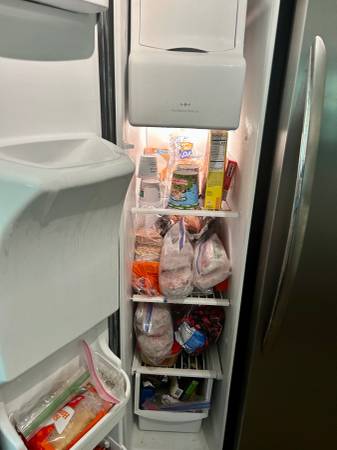 Frigidaire Gallery series side-by-side refrigerator/freezer, stainless steel. Ice maker & water dispenser with new filter & all drawers, etc. Everything works fine, is 15 years old &...