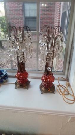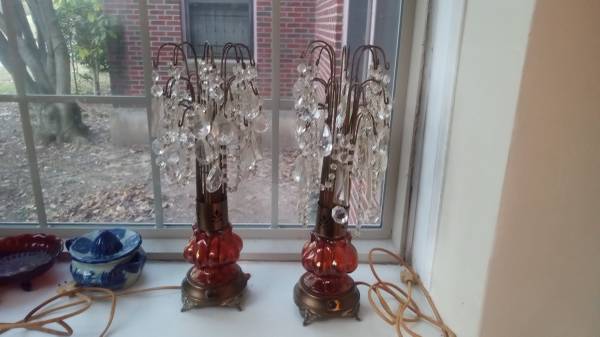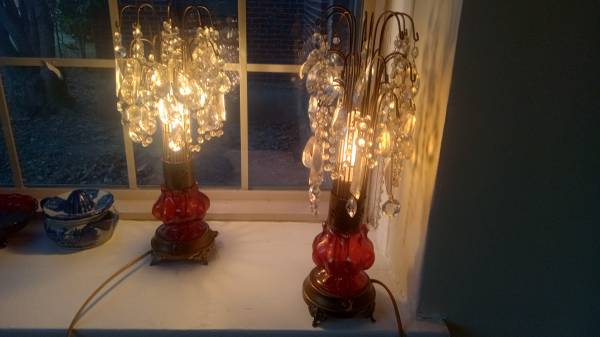 A wonderful set Hollywood Regency Art Deco buffet Waterfall Lamps, Pair Vintage Side Table Lamps Teardrop Crystals, Red Cranberry Glass base. Both work great cords in great condition and overall...