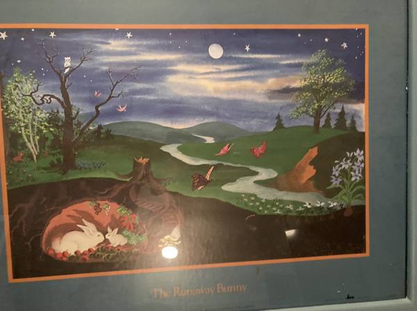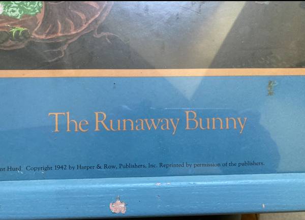 Art poster from the beloved children's book The Runaway Bunny. Poster is dry mounted and framed, but frame needs repainting. Great for a nursery or children's room. 18x24