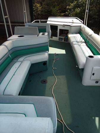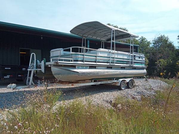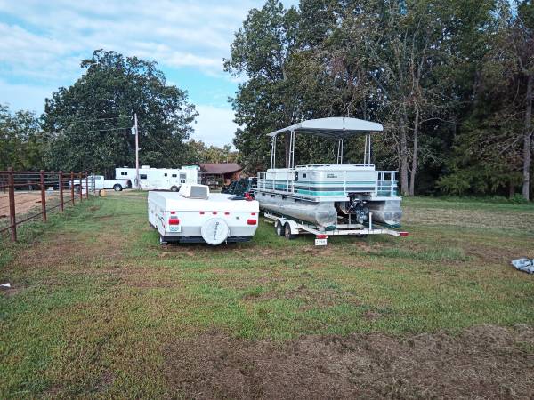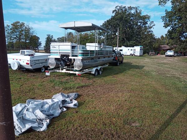 1990 Harris Flote Bote - Classic 24-foot pontoon boat with 120hp OMC 2.3L / SE outdrive. The boat is in good shape overall. The interior is in excellent condition for a 35-year-old boat. The engine has very low hours with excellent compression in all cylinders. The original owner obviously took great care of this boat, likely stored indoors. The previous owner was not a boater and banged up the corners, and a few other minor scrapes. I've repaired / dressed up the corners. Most of the photos are from when I bought it a couple of years ago. It is stored under my shop carport with the included full canvas cover in place. I recently rebuilt the carburetor and replaced the battery. It is now running properly. All new belts and hoses. Engine and outdrive fully serviced. Brand new Garmin GPS plotter. Clear title for the boat and registered through 2026 (HIN - HAMP9324D090).
