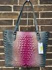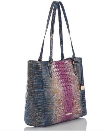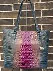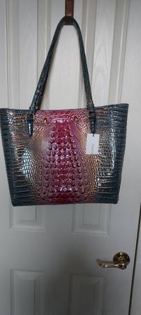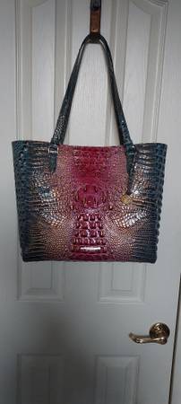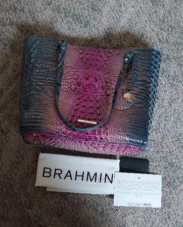 New with tags, Brahmin April Quartz Ombre Melbourne Purse originally more than $325. Never used. Multicolor ombre effect see photos, alligator embossed leather bag. Has 2 leather blue straps with gold hardware and Brahmin charm. Dimensions are 17.5 high, 12.25 across and 5.5 wide/ deep. Bridge snap top closure Exterior back slide-in pocket. Interior signature lining, zip pocket, key leash clip, and additional two kangaroo pockets. Footed bottom to protect purse and it comes with dust bag and registration cards. Large gorgeous bag from smoke free home, never used.