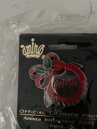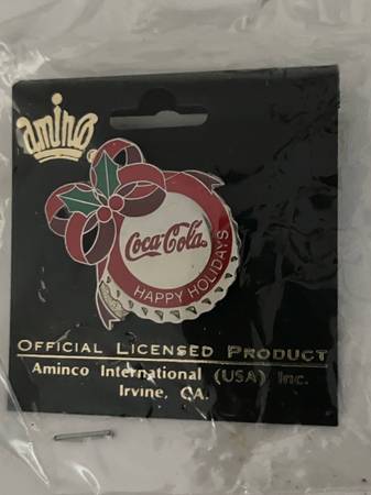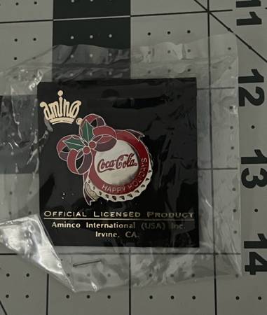 Coca-Cola Coke Happy Holidays Xmas Aminco Bottle Cap Lapel Pin new old stock 1997 New mint in package This is a vintage Coca-Cola Happy Holidays Aminco Bottle Cap Lapel Pin. Product: Coca-Cola Happy...