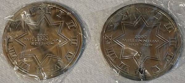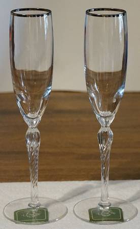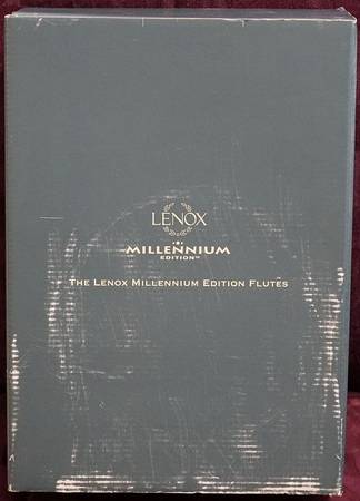 New, never used. Still in original box. Made in USA. Made by Lenox. Made of Crystal. Both flutes have original upc stickers on bottom of flutes. Both 2000 Millennium silver coasters are sealed in plastic wrap. Both Flutes have a silver limning on the top of the flutes. This is the Lenox Millennium Edition Flutes with coasters sure to be a collectors item or or a special event from your life in the year 2000. Will sell for $25.00 Pickup ONLY, can NOT deliver.