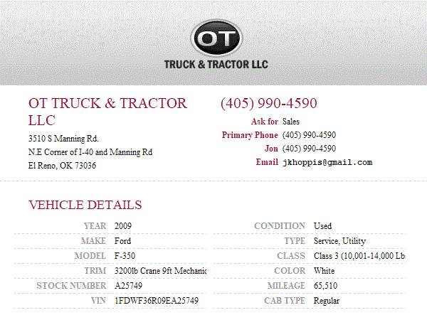 OT Truck & Tractor LLC 3510 S Manning Rd. N.E Corner of I-40 and Manning Rd El Reno, OK 73036 Ask for: Sales Primary Phone: (405) 990-4590 Jon: (405) 990-4590 A27FBAFAEA464DBBB650D168074EE06C 41449294 12087789