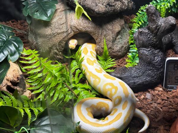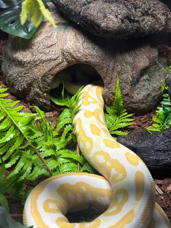 Beautiful albano ball python. Eating frozen thawed medium rats. Never had an issue with her eating. She is also very tame and easy to handle. Around 4ft in length and 1000 grams. I just don’t have the time to care for her like I should. I can include all decorations but the cage is not included. If you want all the decor, hides water bowl and other enrichment it will be an extra $50. AGAIN CAGE IS NOT INCLUDED. This is for snake only and decorations for extra$$$ call or text if interested