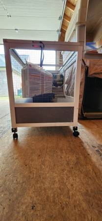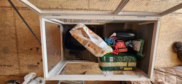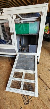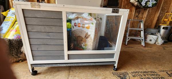 Rabbit cage in good condition. Has one ramp door and the top opens. It also has a pull-out tray for easier cleaning. You can have whatever grass and pellets I have left, too.
