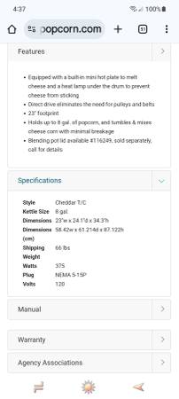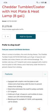 When it comes to tumblers, this one’s the big cheese. The Cheddar Tumbler/Coater #2703-00-000 holds up to 8 gal. of popcorn and tumbles and mixes cheese corn with minimal breakage. The tumbler only has a 23" footprint and comes equipped with a built-in mini hot plate to melt cheese, and a heat lamp under the drum to prevent cheese from sticking.