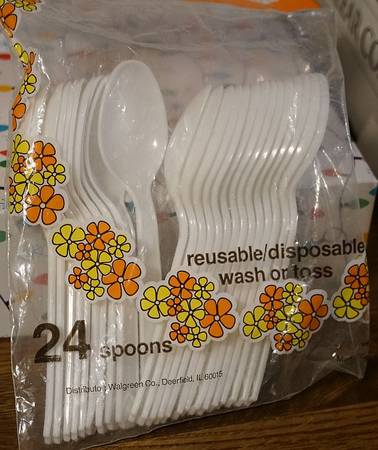 New, never used. Comes with Forks (Clear)-54 and Black-30. Spoons (Clear)-102 and Solid white -49. Knives (Clear)-125. A total of 360 pieces. Box included. Will sell for $8.70
