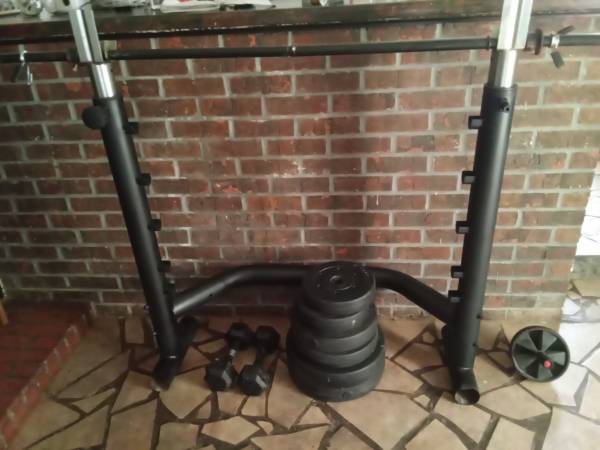 2 25lbs 2 20lbs 2 15lbs 2 10lbs 2 15 iron dumbbells 130 lbs total Free macy weight stand and ab roller with purchase