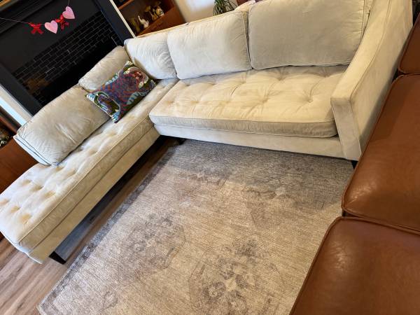 Very comfortable L shaped sectional in a tan/greige microfiber. Purchased from Stash furniture. Measurements are 105 inches across and the chaise is 90 inches long.