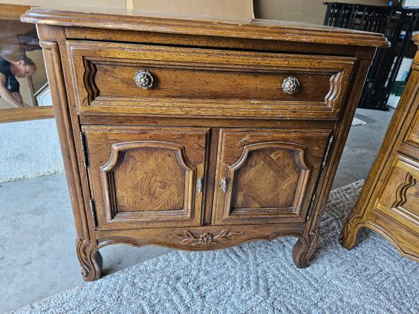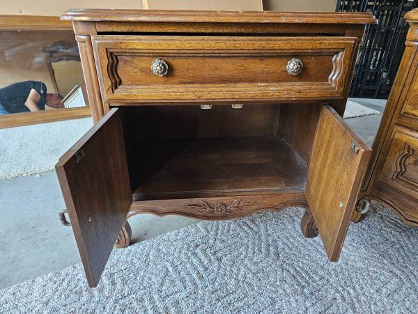 This nightstand has a double door cabinet area and drawer providing ample storage and organization options. Crafted from solid wood in the original finish and the original hardware.