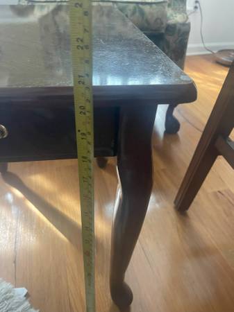 Matching coffee and end tables (x2) with drawers. Excellent condition. Coffee Table 45"L x 27"W x 16"H End Tables 23"L x 17"W x 21"H