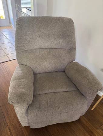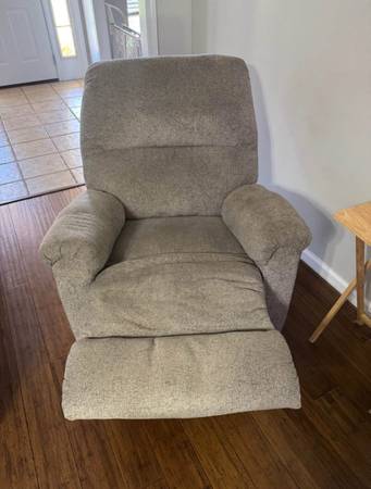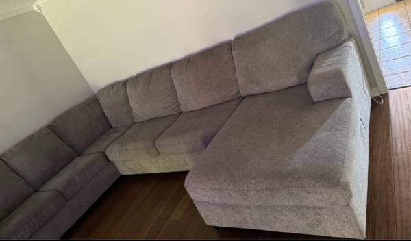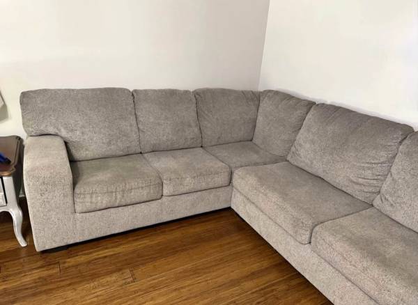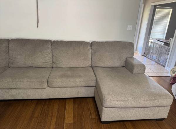 Sectional sofa with matching recliner chair. Light gray color. Sectional has small seem area that is starting to wear on edge as shown in pics. Recliner also has small area where threads are wearing at a seem. Non pet and no smoking home. 450 obo can help load