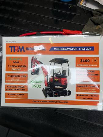 New never used mini excavator with 24 horse power Kubota D902 diesel engine. Machine has hydraulic thumb, swing arm and pilot controls It weighs 3100 pounds and is a very strong capable machine....