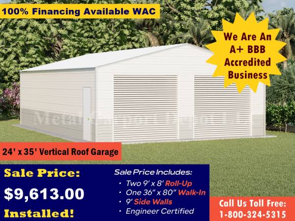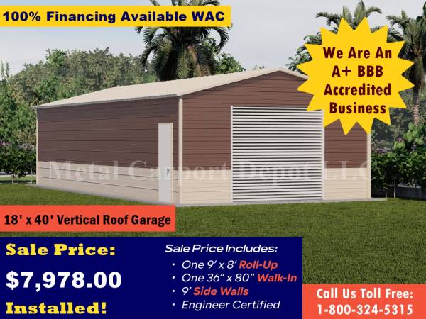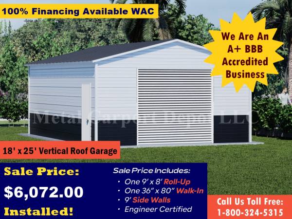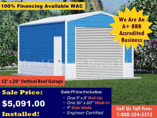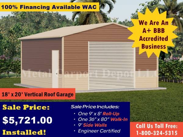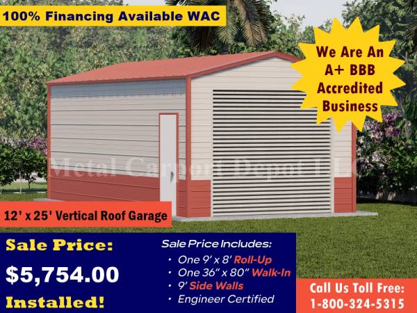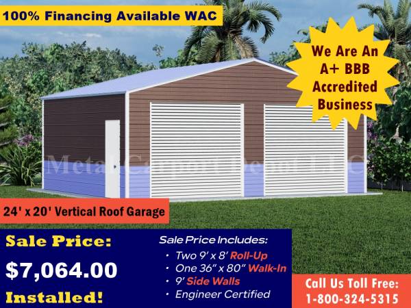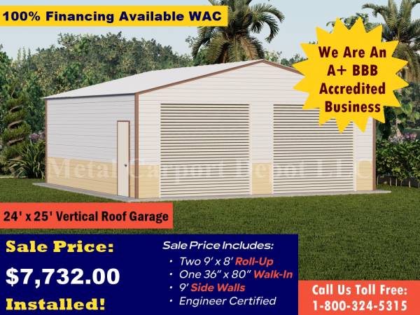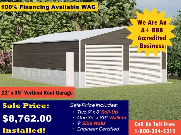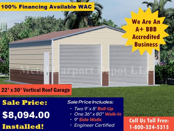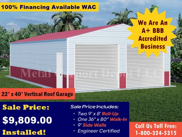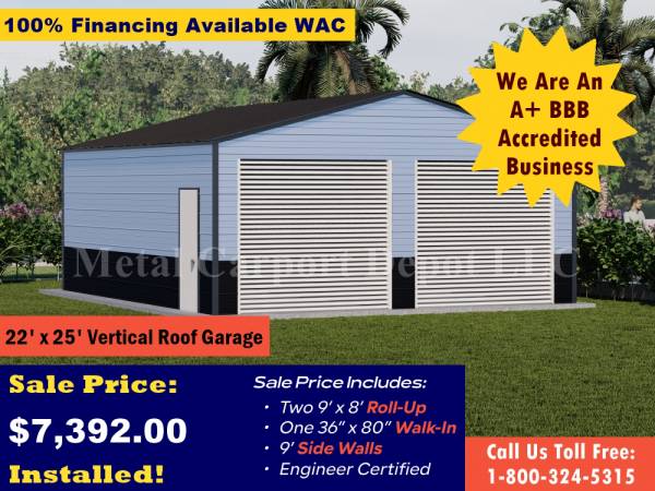 Safeguard and Protect Your Valuable Vehicles and Equipment From the Elements for Years to Come with this 22' x 21' Boxed Eave Style Metal Building with the 29 Gauge Vertical Metal Roof. It is on sale now for just $6,747.00 After Discount, Including Free Delivery and Installation on your Existing Concrete Slab or Level Ground. 10% Off All Structures Up To 30' Wide Priced Up To $6,999.00 And 15% Off All Structures Up To 30' Wide Priced $7,000.00 And Up! These Special Prices Will End 03-31-2025. Call Now To Save Big!