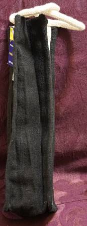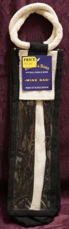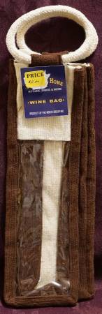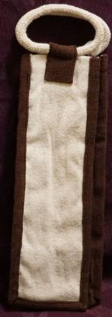 This is a contemporary single-bottle wine bottle carrier. 100 % cotton material with clear vinyl half window in front. Handles are made of cotton. I have another in Black & White color, also in Brown & White Color. These would make a nice gift with or without the wine included.. Will sell them for $2.00 each. Pickup ONLY, will NOT deliver.