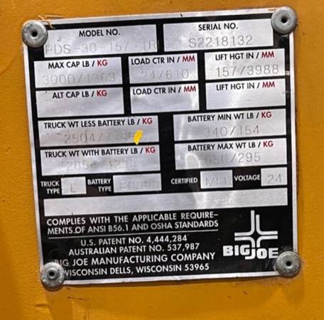 Big Joe Powered Pallet Truck PDS-30. Battery powered pallet truck and stacker, 3000 lb capacity and over 10 ft of lift. In good condition. Buyer pays to deliver. We had bought this to use in our...