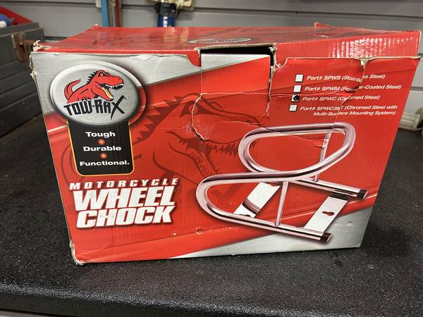 Brand new and never used, still in bubble wrap . Tow-Rax motorcycle wheel chock - $35 new but yours for $15. CASH ONLY