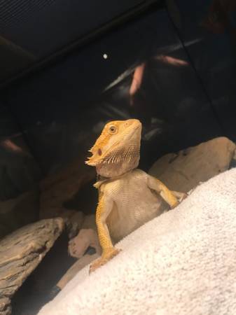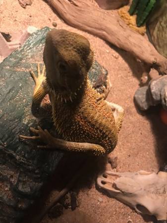 A few months old eats great even his veggies, loves to be held. Comes with 2 cages 40 gal. And 20 gal. Extra heat lights has lots of hiding rocks and wood pieces asking 300 for all 100 just for him