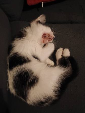 This sweet female kitten (about 2 months old) was left behind by a neighbor when they moved out. But she’s been cared for, flea and worm treated, and is now healthy, playful, and affectionate. She loves people and gets along with other cats.