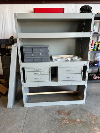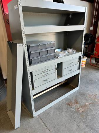 Steel shelving for high roof van. Two sets of drawers and small parts bins. All mounting hardware included.