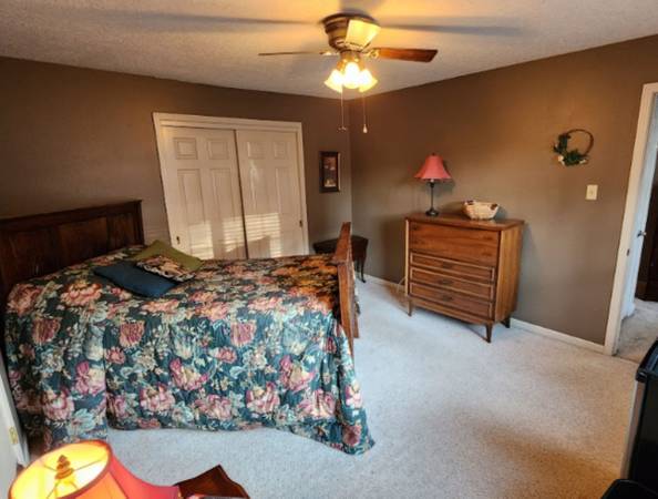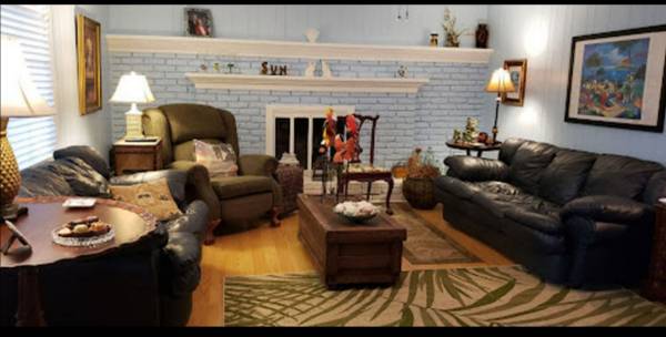 - Large den furnished with antiques/reproductions, recliner, Large LG TV with Firestick + local channels, leather sofa and loveseat