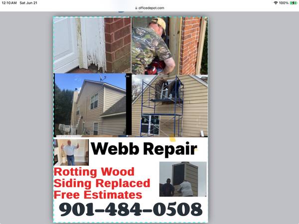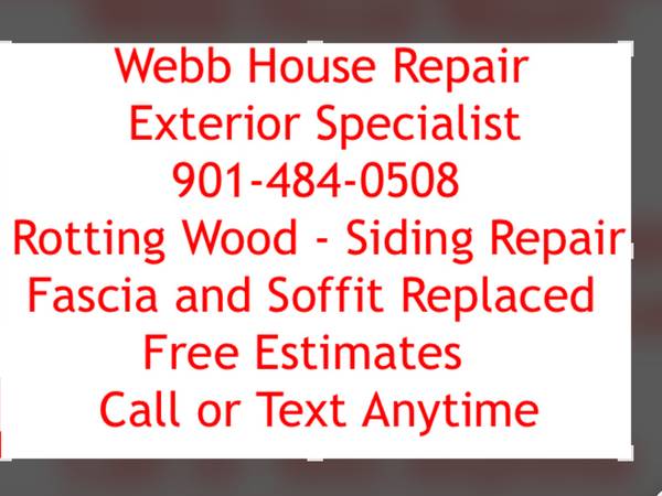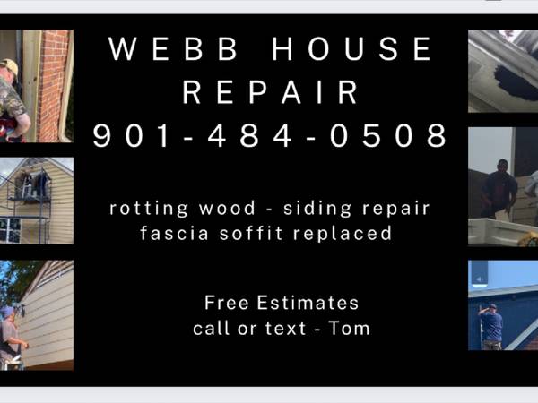 Free estimates. Exterior house repair. Rotting wood - siding repair - fascia and soffit repair. Painting residential and commercial . In business for 40 years. Call or text anytime. Tom 901-484-0508.
