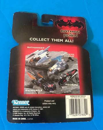 This is a brand new, never used Freezemobile die cast metal car from the 1997 Kenner Batman & Robin series. The vehicle is in mint condition and has never been removed from its original packaging. It is a great addition to any Batman collection and perfect for fans of the series. The car is made of high-quality die cast metal and features intricate details that make it look just like the one seen in the movie. This item is a must-have for any serious collector.