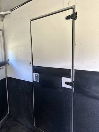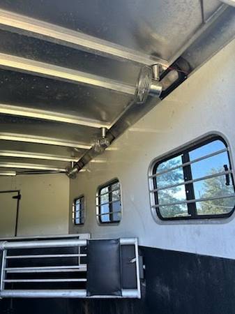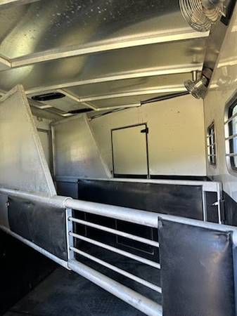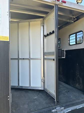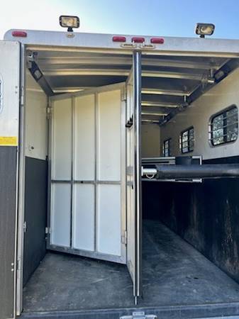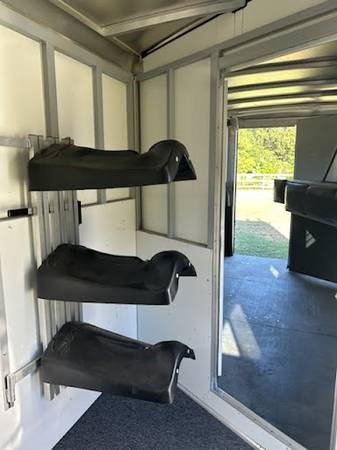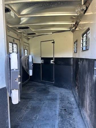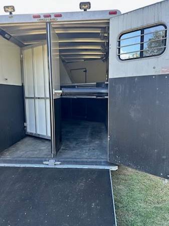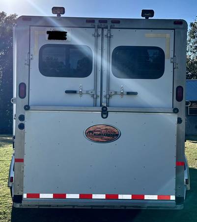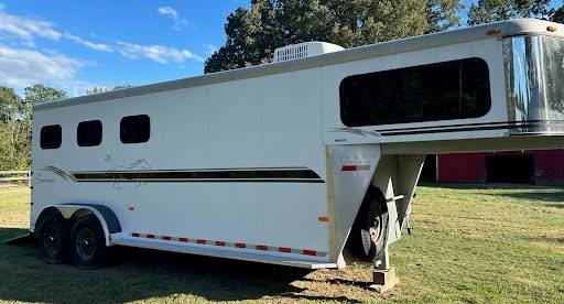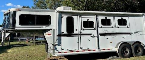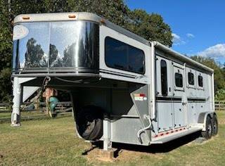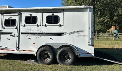 2001 Sundowner 3 horse slant gooseneck trailer: with air conditioning, electric system, large tack/weekend/dressing room, walk through door, rear collapsible tack rack, individual horse fans, drop down windows, drop down ramp, awning (needs new fabric), tires including a 3 year old spare tire with only 3000 miles. Trailer is in very good, very lightly used condition.